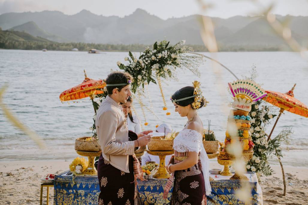 Balinese Hindu Wedding Ceremony is a marriage process carried out using traditional Balinese culture customs by using wedding offering ceremony which is sanctioned by a Brahmin priest or village priest in accordance with the cultural customs of the place where the wedding took place. Balinese Wedding is something that is very sacred and also involves several residents in a village to help run this wedding ceremony, where the families will be busy preparing everything related to this wedding ceremony, Balinese Wedding Ceremony is a unique wedding procession based on Balinese Hindu rituals where the couple will be inaugurated as husband and wife in a spirit realm with using the Banten wedding facilities that have been prepared in advance, so marriage in Bali is a very sacred thing. To be married with someone you love in a very special way should be a special event and held in a very exotic place. Which is why many westerners have been choosing Bali as their place to get married. It has romance, mysticism and a unique culture which will give a very meaningful impression for a lifetime in a marriage using Balinese cultural customs.The Hindu wedding ceremony is called Mekala-kalaan (natab banten) led by a holy person and witnessed by three witnesses, namely Bhatara Sakti, Dewa Saksi, and Manusia Saksi ( human witness ).